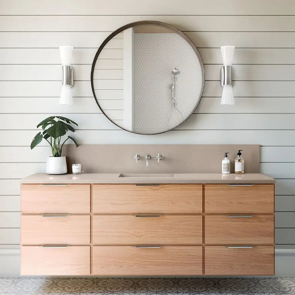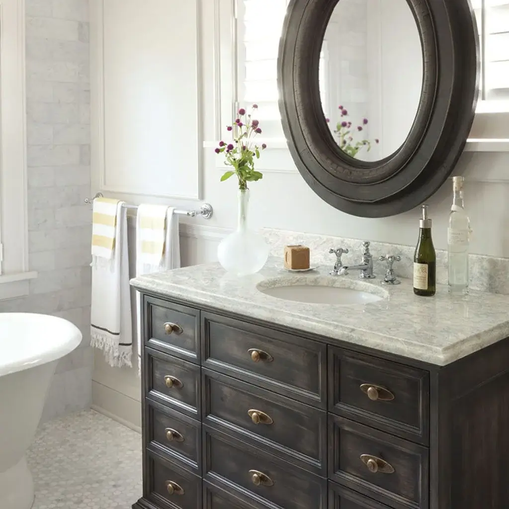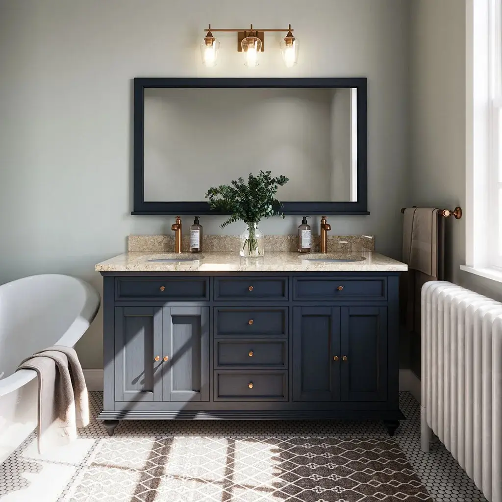Matte black or brushed nickel fixtures, mirrors, lighting, and storage add‑ons.