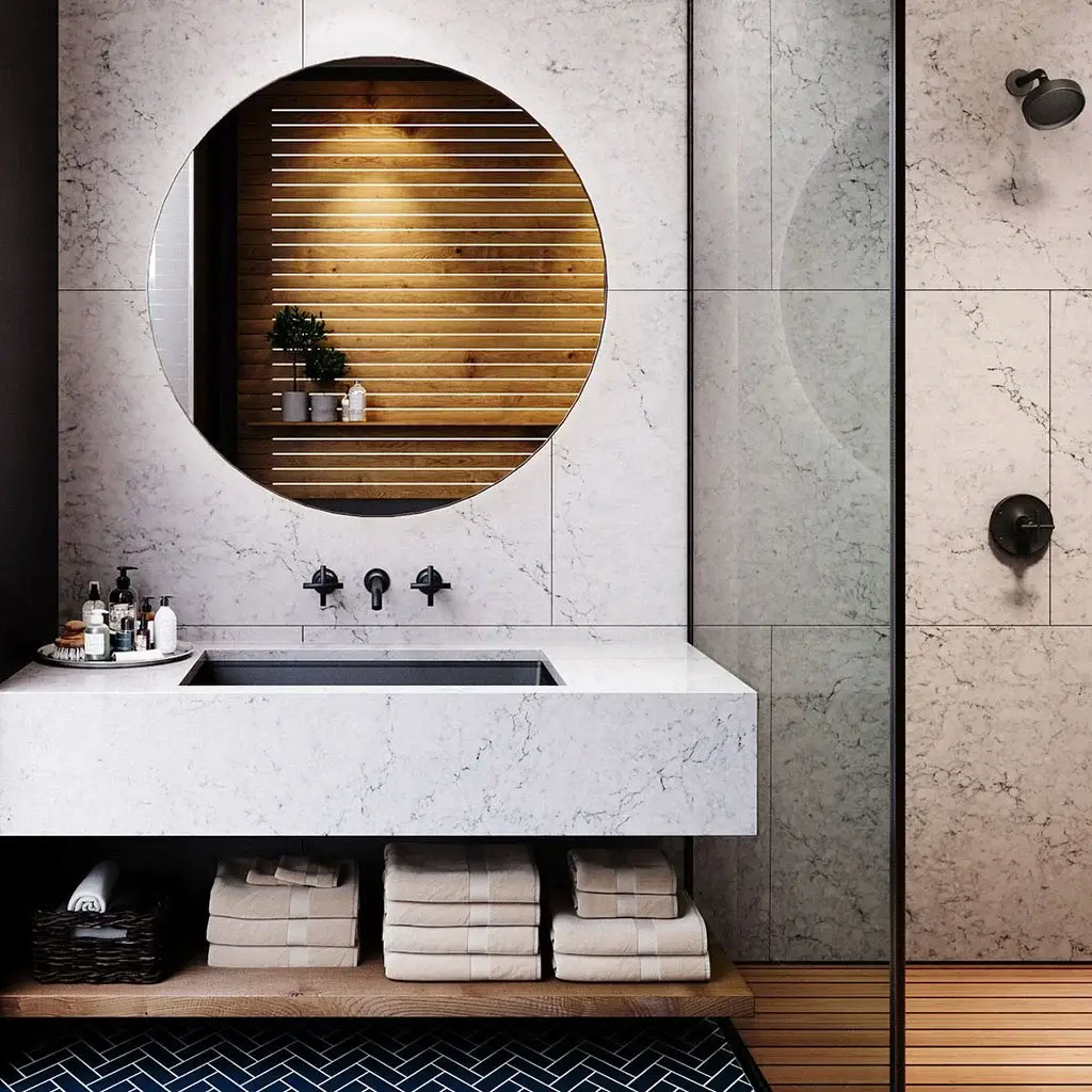 Porcelain & ceramic tile, or waterproof luxury vinyl for faster installs and warm underfoot feel.