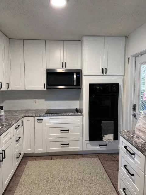 Cabinet doors refaced and painted with new granite countertops, creating a clean, updated kitchen without full replacement.